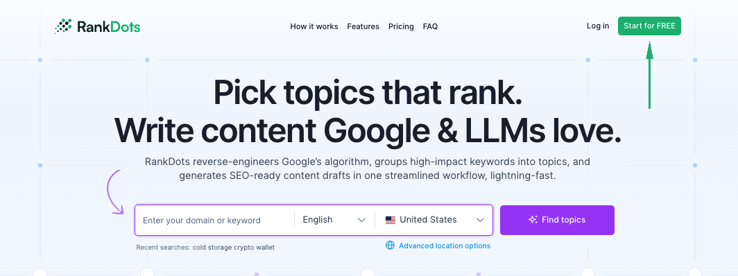 To start your trial, proceed to rankdots.com and click the 'Start for FREE' button in the top menu: