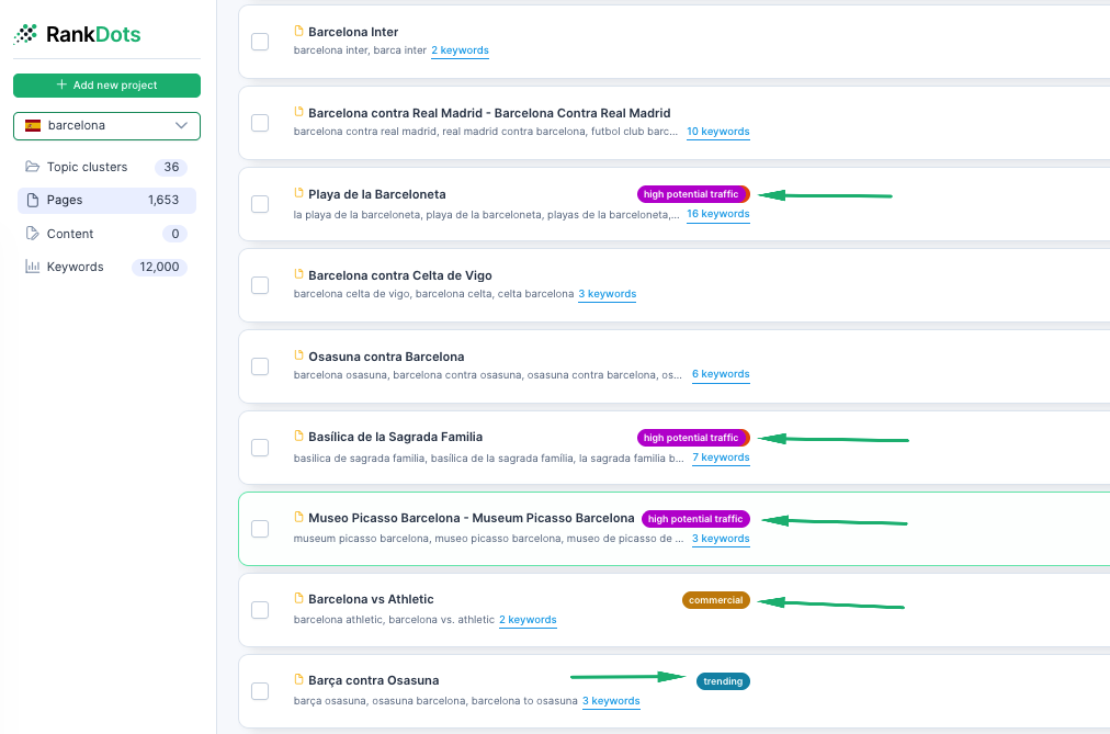 When you open the Topic Clusters view in RankDots, you'll notice that some topics display a colored label in the top-right corner of their card — labels like high potential traffic, high volume, trending, commercial, and low difficulty. This article explains what each label means, how they are calculated, and how to use them to prioritize your content strategy.